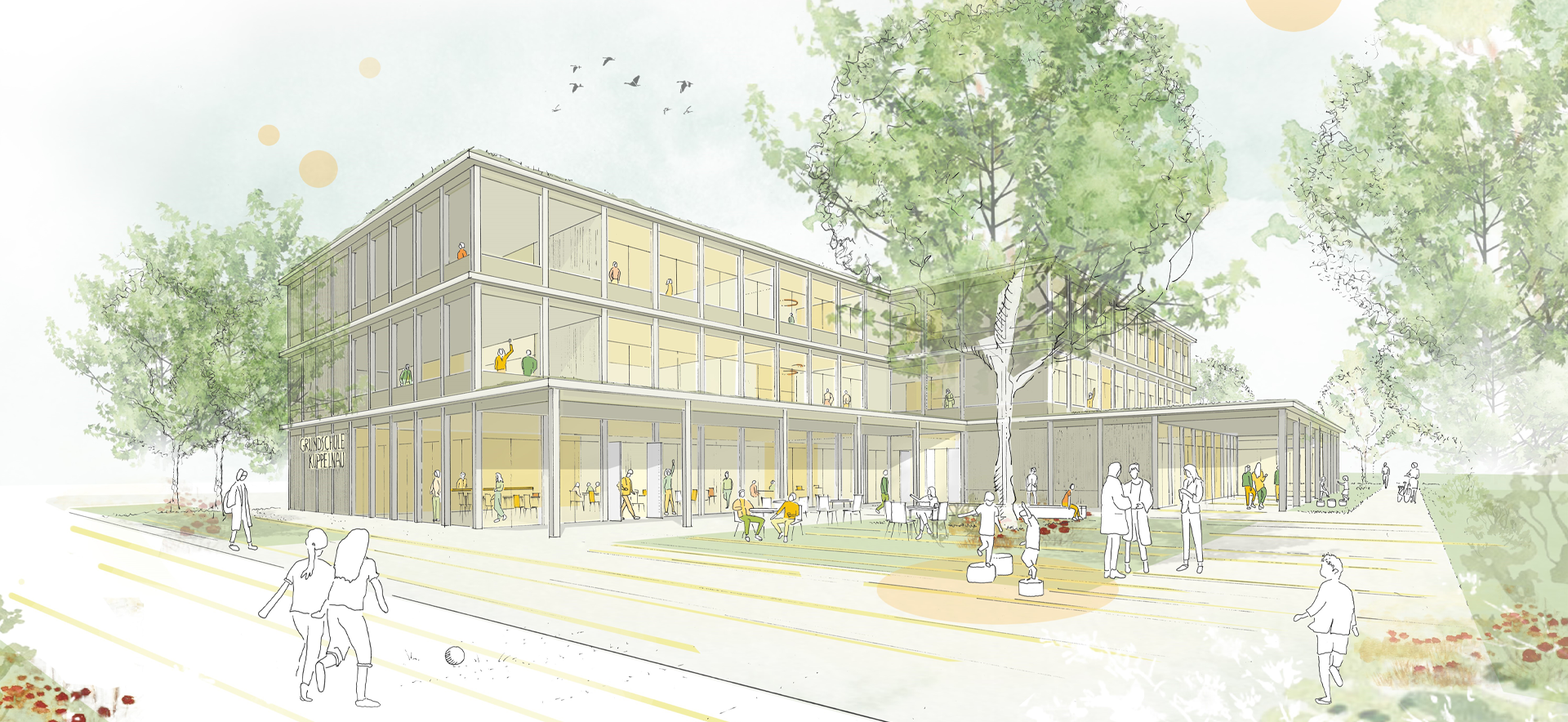 Eine durchdachte Raumaufteilung mit hellen Räumen ermöglicht eigenverantwortliches Arbeiten ebenso wie klassischen Unterricht. Auch die Außenanlagen werden neu gestaltet. Mit grünem Klassenzimmer, Schulgarten und Bewegungsinsel entstehen vielfältige Orte zum Lernen und Spielen.